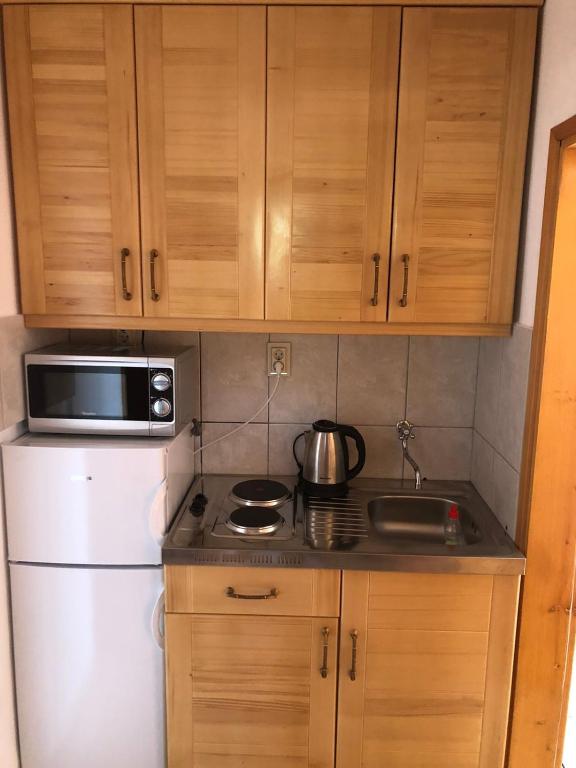 čajna kuhinja, frižider, mikrotalasna rerna, kuhinja, posuđe, ploča za kuvanje